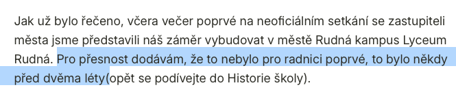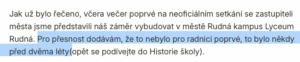 Potvrzuje se černé na bílém to, co jsme již věděli od února 2026: radnice a lyceum jednají o projektu již dva roky. Tato informace je potvrzena přímo na webu lycea. O to šílenější je naše obviňování, že jsme odpovědní za starostou předložené memorandum. Vrtěti psem v Lubošově stylu.