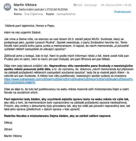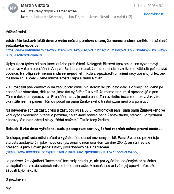Na základě Vašeho jednání s dosud neznámým panem Svobodou dne 19.3.2026 jste hned druhý den ráno přeposlal zastupitelům memorandum a pana Svobodu označil za investora. Rovnou jste navrhl termíny pro neveřejnou schůzku zastupitelů s tímto „investorem“. Po medializaci vydává rada města vyjádření, že se od Vámi předloženého dokumentu důrazně distancuje. Níže píšete, že se předložení memoranda týká nás. Netýká.