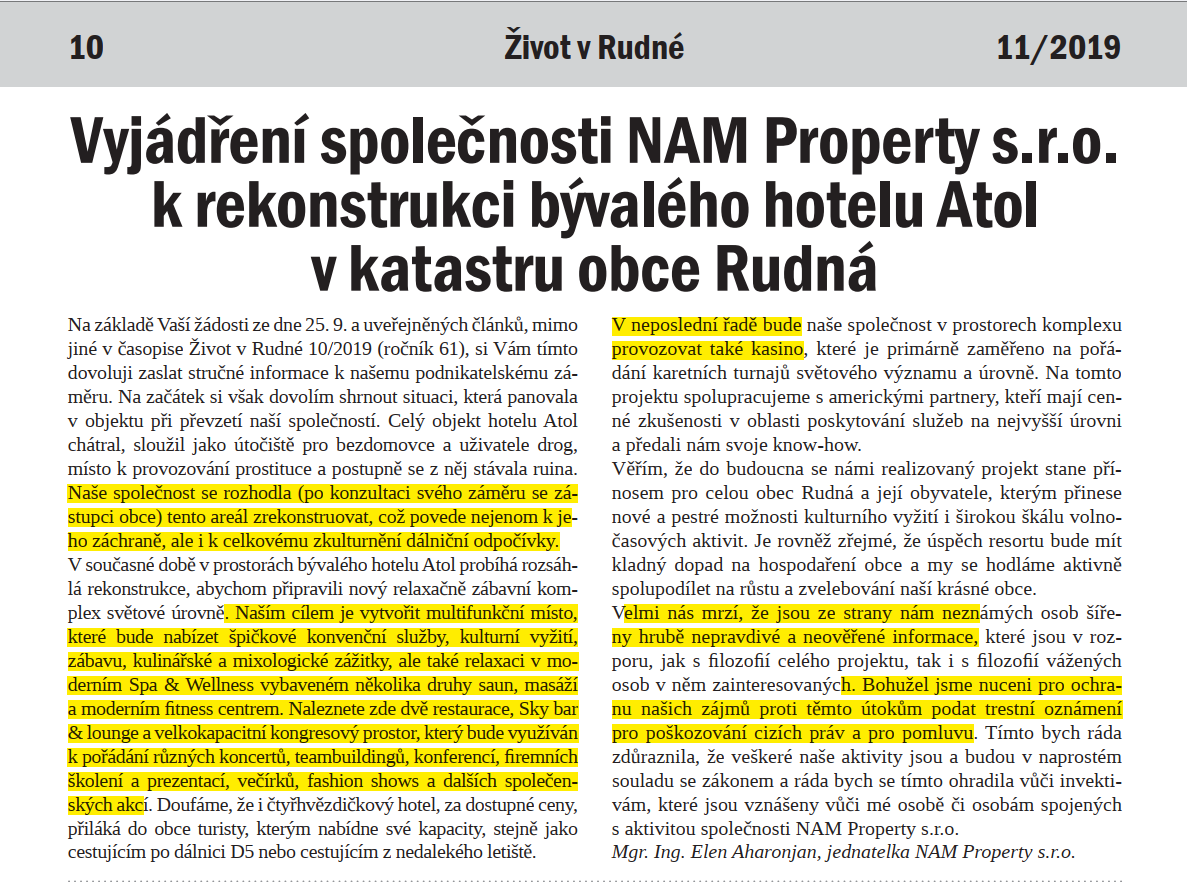 Další článek v časopisu Život v Rudné. Opoziční zastupitelé Prokop, Viktora a Tůma údajně informují o chystaném hazardu bez znalosti věci, bez ověření informací a s řadou spekulací, hysterických výlevů a hlavně bulvárně. Prý se tak trochu dalo čekat, „že se někdo ozve“ (skutečně se ozval, dorazily výhružky od právníka). Článek je avízem vyjádření vlastníka objektu, které vyšlo ve stejném čísle – viz článek výše. Článek v ŽvR je k dispozici zde.